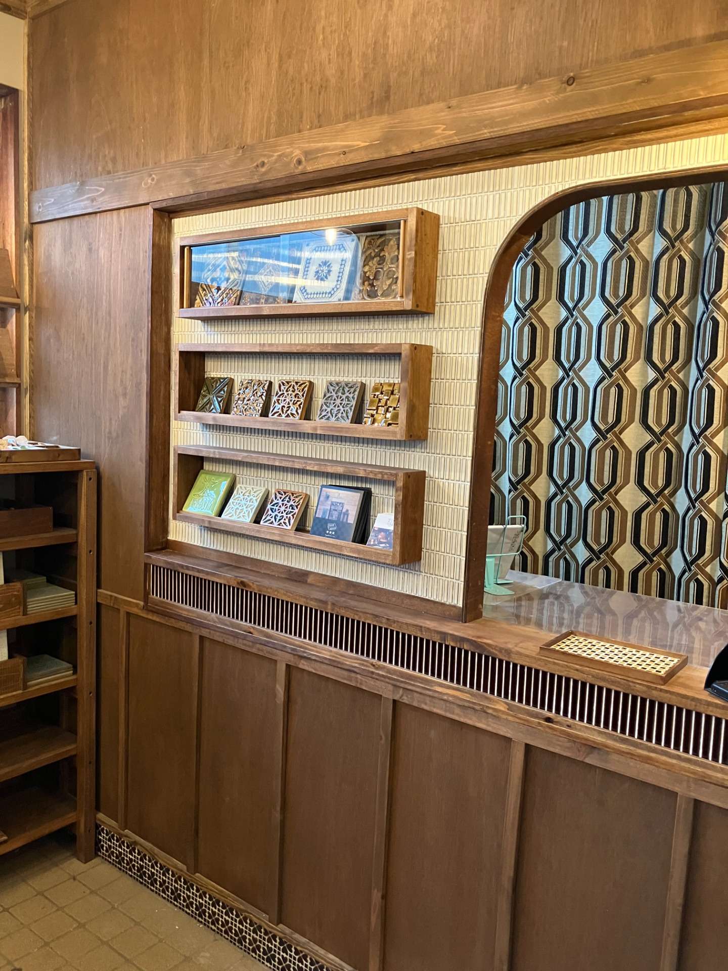 窓口の横の細長いケースはクラフト系のタイルのディスプレイスペースに。