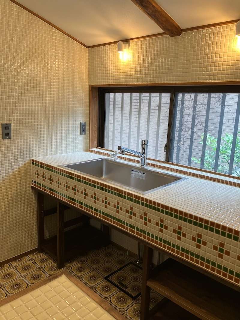 昭和レトロな雰囲気のタイルキッチンがこの家の中心になっています、