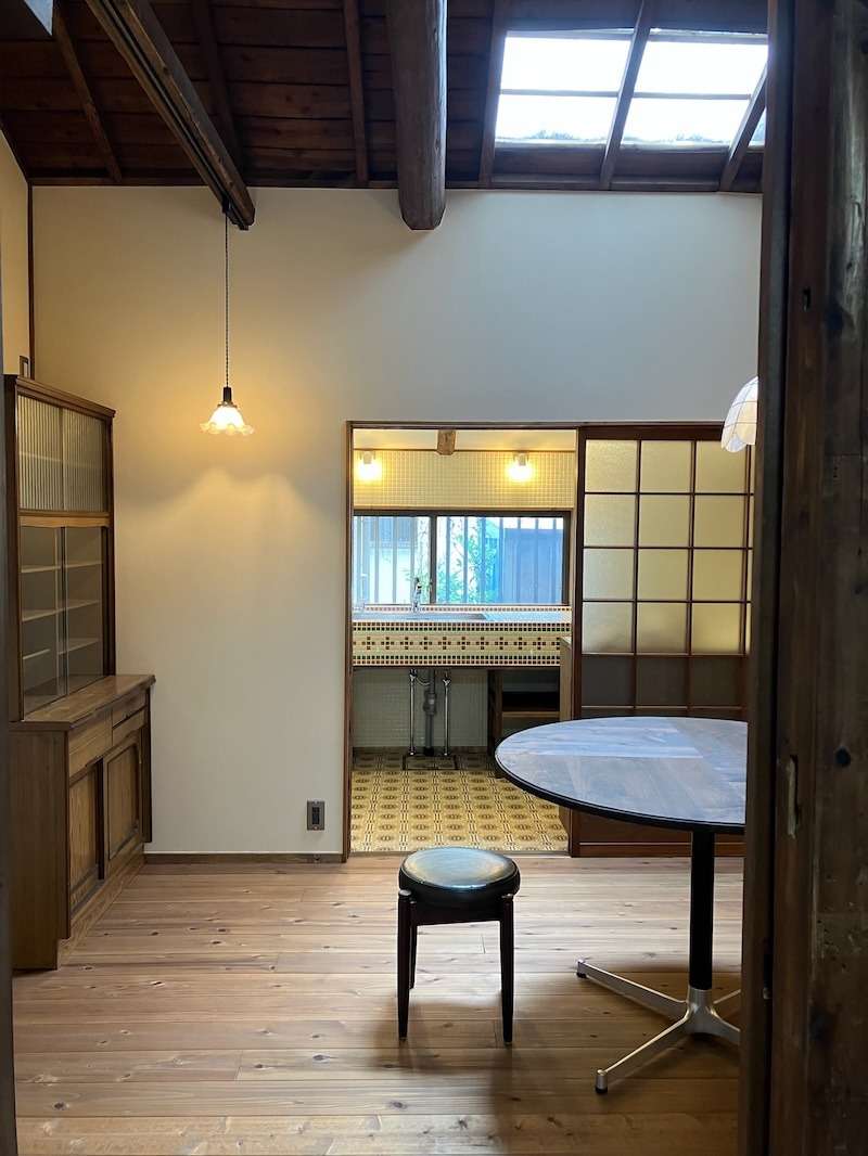 内装に使われていたガラス建具はすべて再利用。お家のベースはそのままで、耐力壁はのこしつつ壁を一部解体し、リビングを広げました。リビングの奥にみえてくるのは見た目もたのしいタイルキッチン。
