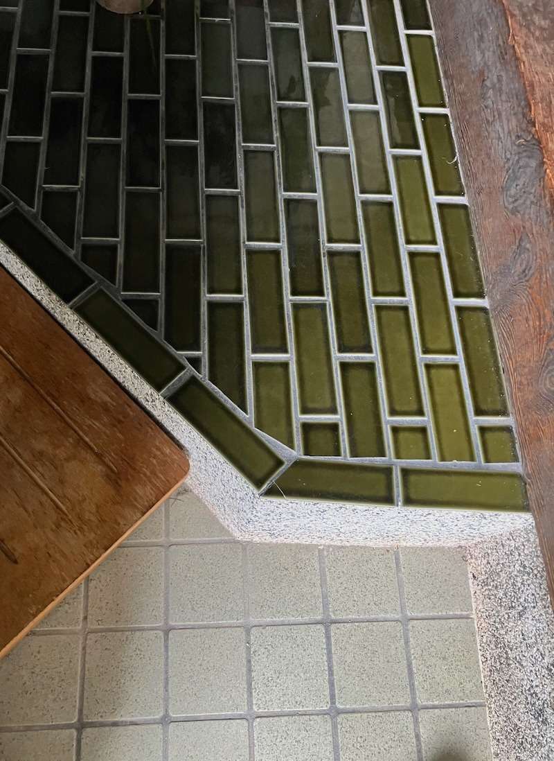 しつらえがとても面白い庶民家。お部屋の天井が切妻天井になっていたり、建具に使われているチェッカーや石目ガラス。そして玄関先の床ステップにあしらわれた織部色のタイル。